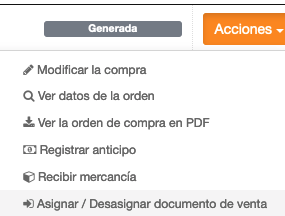 Para desasignar un documento de venta o asignar un documento de venta diferente al que ya se encuentra asignado a la orden de compra es necesario ingresar al módulo de Compras y gastos, sub módulo de Órdenes de compra, desde el botón de acciones de la orden de compra usar la opción de Asignar/Desasignar documento de venta.