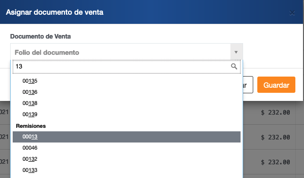 En la ventana que se abrirá será necesario elegir el folio del documento al cual se va a asignar la orden de compra en este ejemplo se elegirá la remisión con folio 13