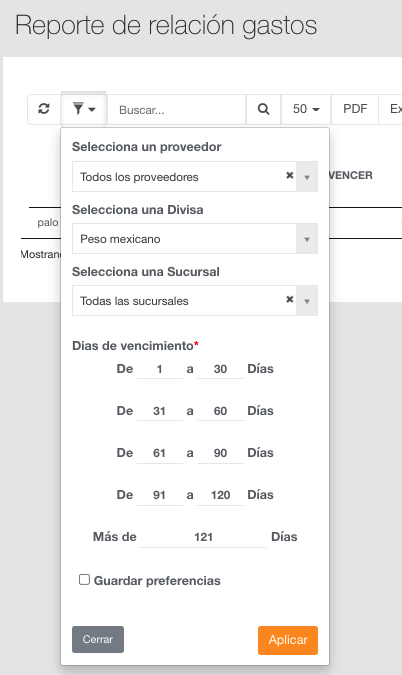 Se puede filtrar por proveedor, divisa (moneda), sucursal, días de vencimiento.