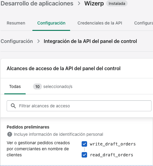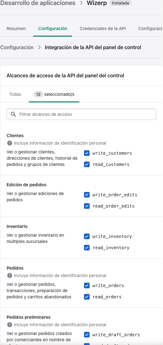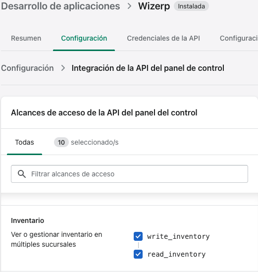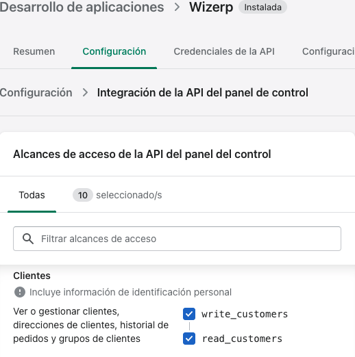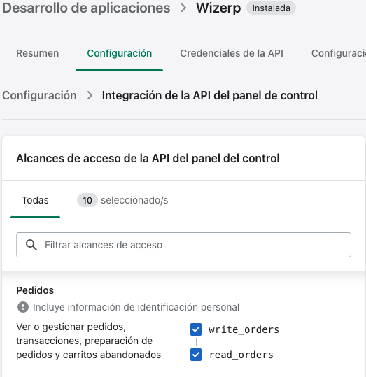 8.- Una vez seleccionados los Alcances de acceso de la API del panel de control del paso 5 al 5.7,  podremos agregar los Webhooks para aprovechar al máximo nuestra integración con Wizerp.