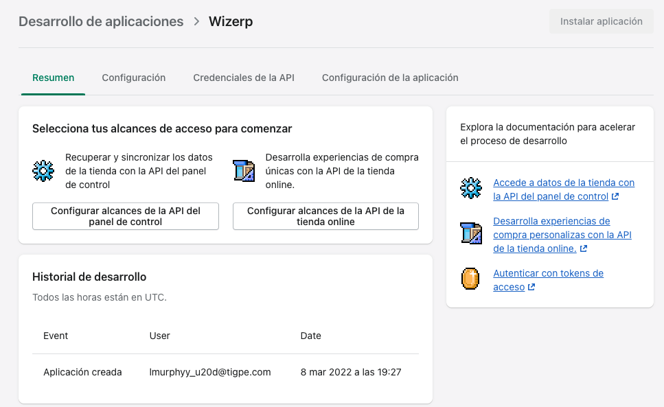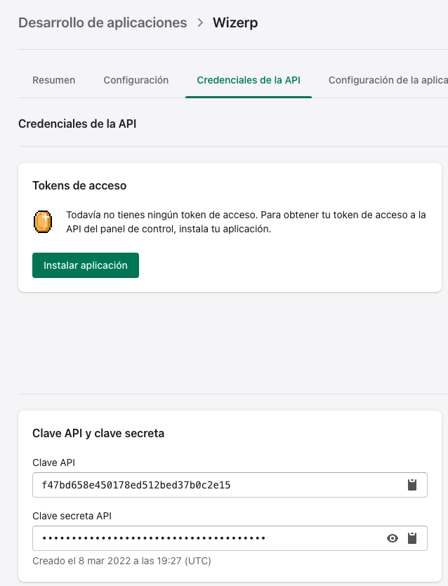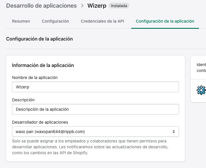 7- En la pestaña de Configuración de API debemos de llenar los campos de "Nombre de la aplicación", que en este caso es Wizerp.