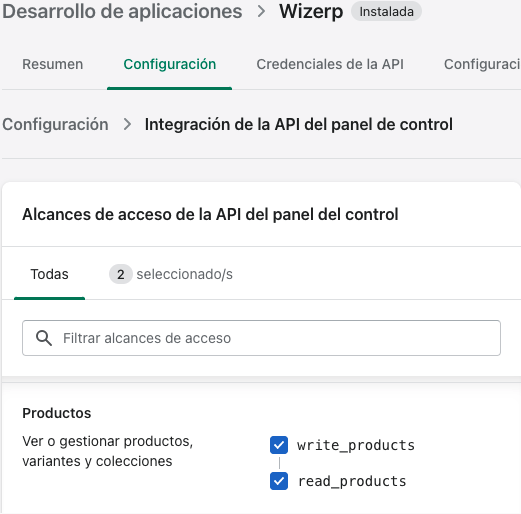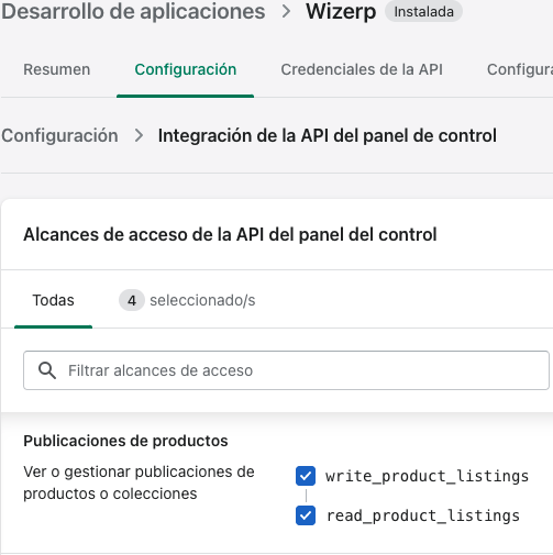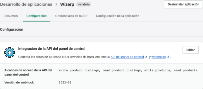 5.-Lo primero será agregar los permisos necesarios que serán compartidos entre Wizerp y su e-commerce, esto ingresando al la opción de Configuración y usar el botón de configurar o editar.