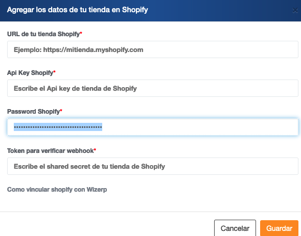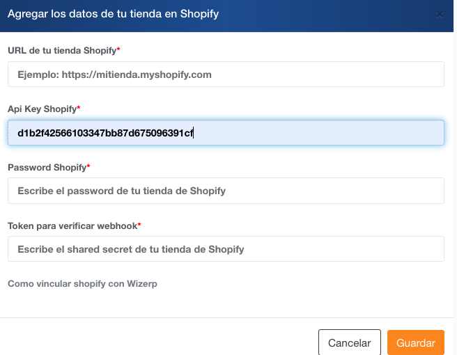 6.2.-En el campo de API key Shopify en Wizerp se debe de agregar la "Clave API"