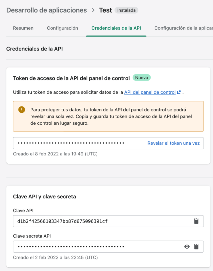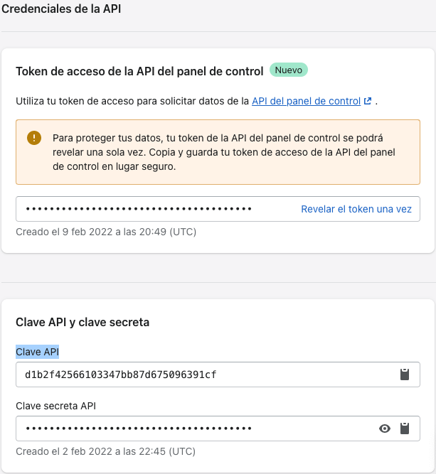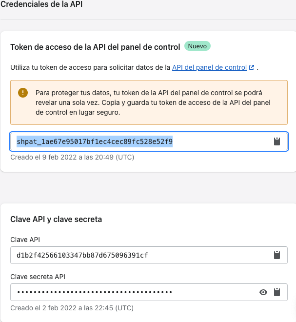 6.3.-En el campo de Password Key Shopify de Wizerp se debe de agregar el Token de acceso de la API del panel de control, se debe de hacer clic en la leyenda de Revelar el token una vez, esto nos mostrará el token y la opción para copiar el mismo, este token se debe de agregar en el campo Password Key Shopify.