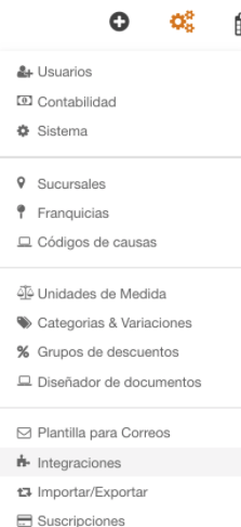 1.- Desde el sistema de Wizerp usar el engranaje de configuraciones y entrar en la opción de integraciones.