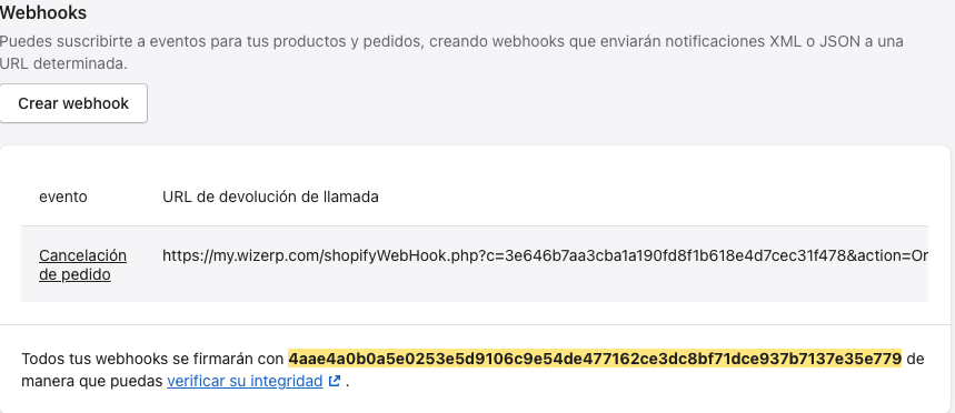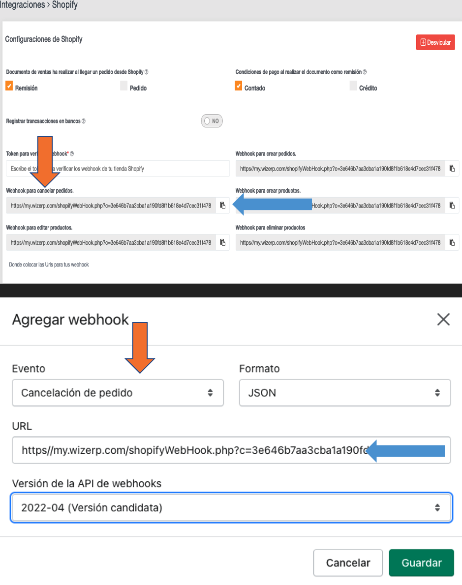 Copiando  la información que aparece en el campo de “Webhook para cancelar productos” de la ventana de Wizerp.